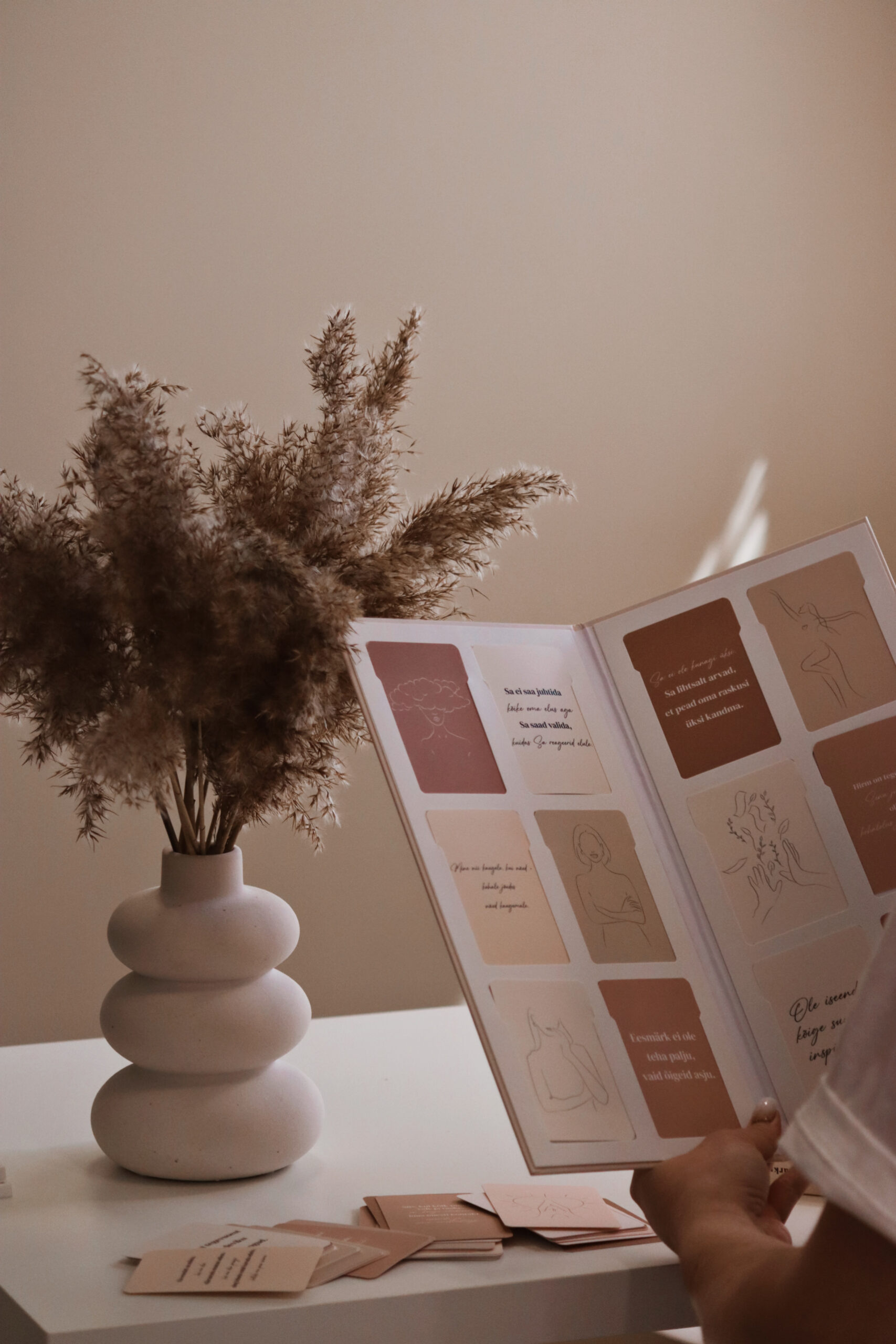 Visioonitahvli pakendist leiad tugevad kaaned, milles on avad kaartide sisestamiseks. Ava kaardipakk ning vali välja 12 kaarti, mis Sind hetkel kõige rohkem kõnetavad. Kui oled kaardid välja valinud, libista need vaikselt kaartide jaoks ette nähtud sahtlitesse. Kui tekib küsimusi, võta meiega ühendust.